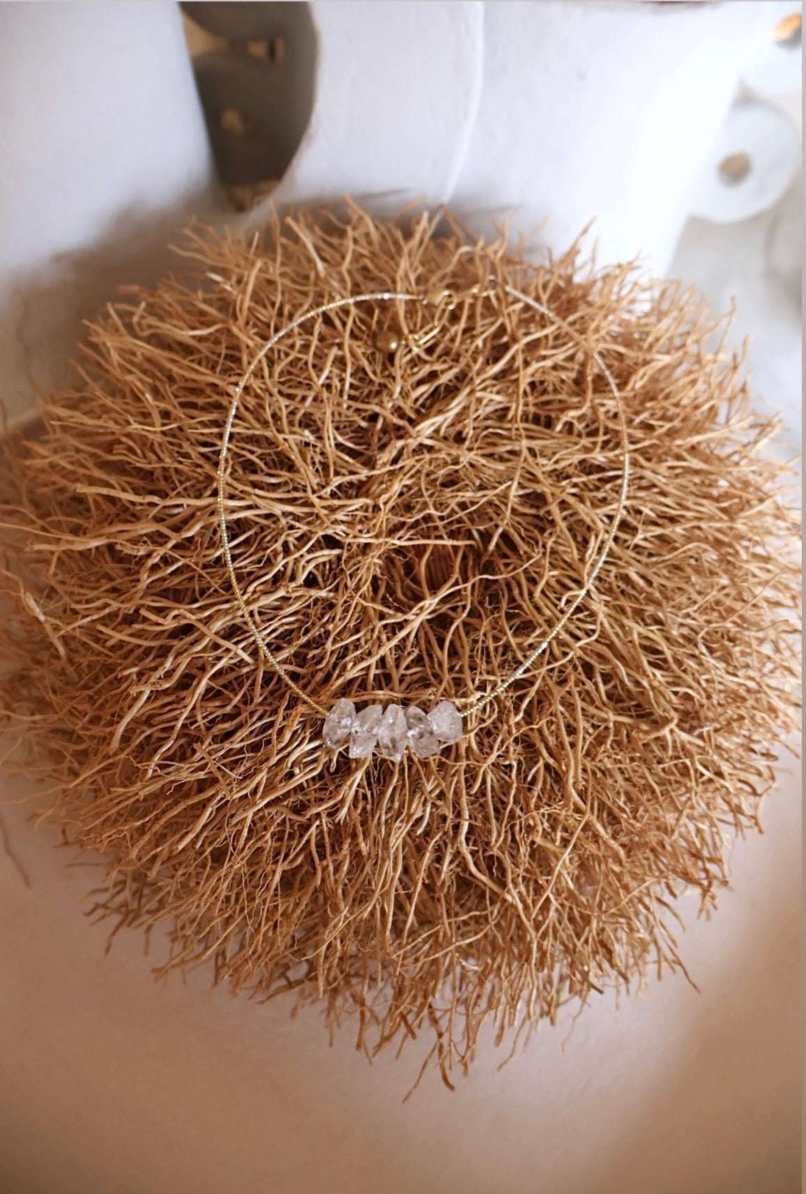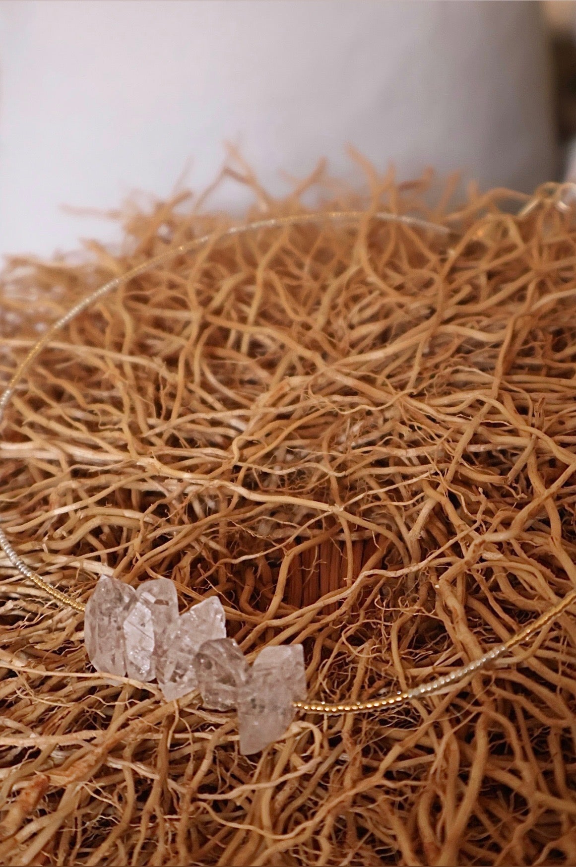 This stunning necklace is strung with an assortment of gold and silver infused spacers, adding a playful finish to this shorter statement piece. A beautiful piece of Herkimer diamond takes center stage, enhancing the polished and stylish effect of the design. Because of the natural stones, please note that each piece will vary slightly. To place a custom order please call our Santa Fe, NM shop at 505.988.8006 or email shop@bittersweetdesigns.com