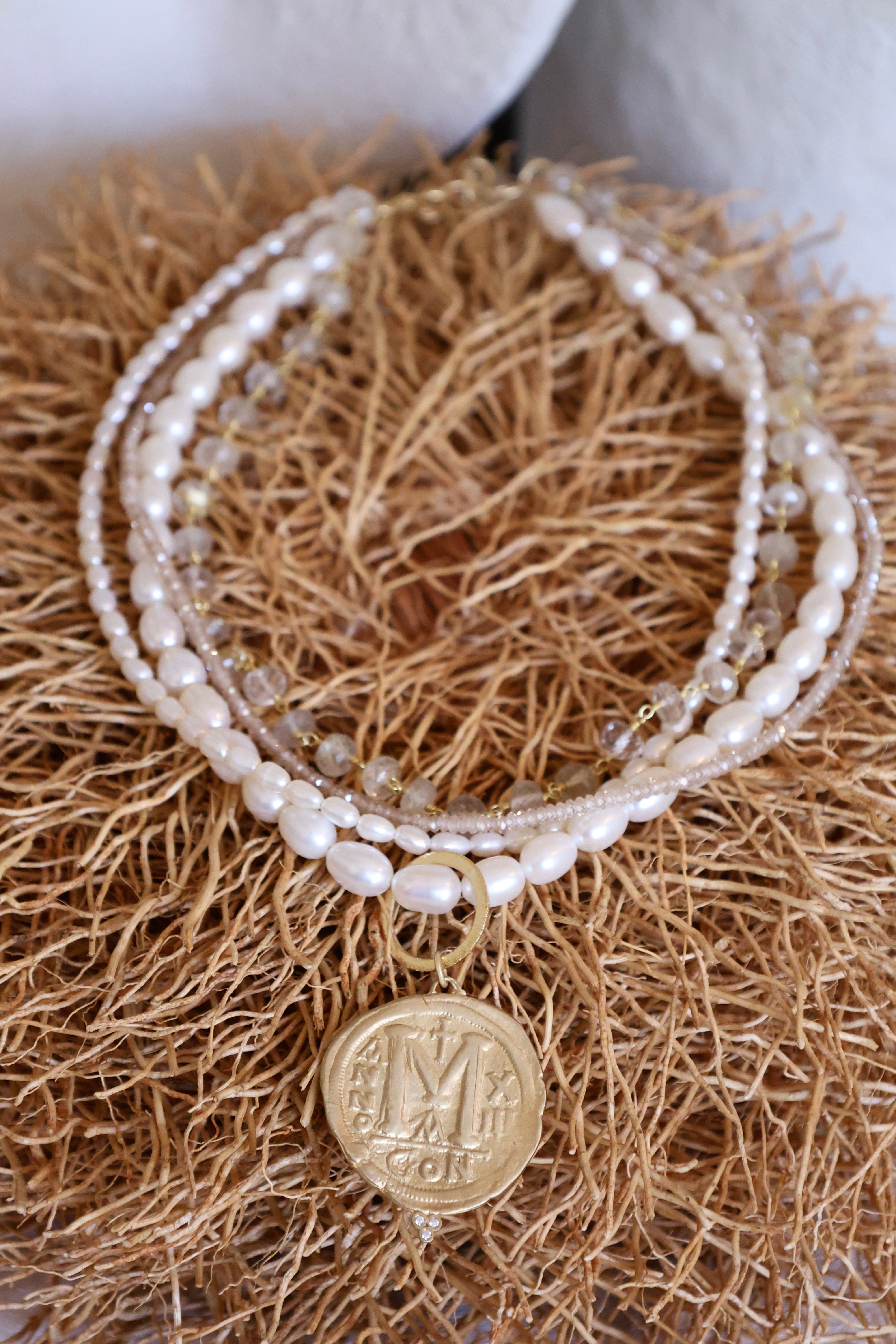 Versatility takes center stage as this Flaneur necklace offers two delightful styling options. Wear it as an elegant 18" choker featuring four strands of semi-precious stones and a chic gold finish chain. Or, effortlessly transform it into a 36" long necklace by unclasping and separating the strands into two sets.