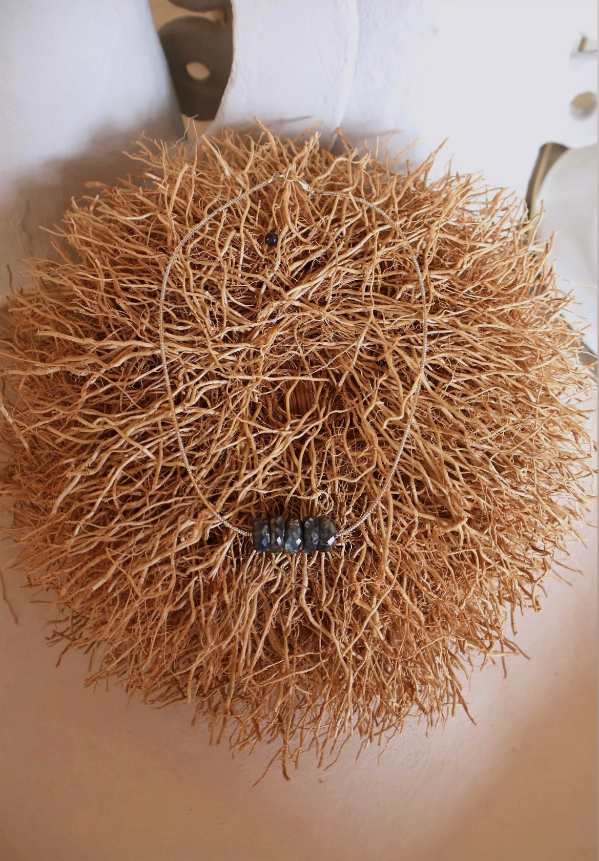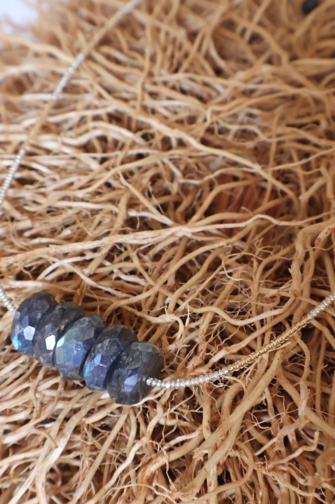This stunning necklace is strung with an assortment of gold and silver infused spacers, adding a playful finish to this shorter statement piece. A beautiful piece of Labradorite takes center stage, enhancing the polished and stylish effect of the design. Because of the natural stones, please note that each piece will vary slightly. To place a custom order please call our Santa Fe, NM shop at 505.988.8006 or email shop@bittersweetdesigns.com