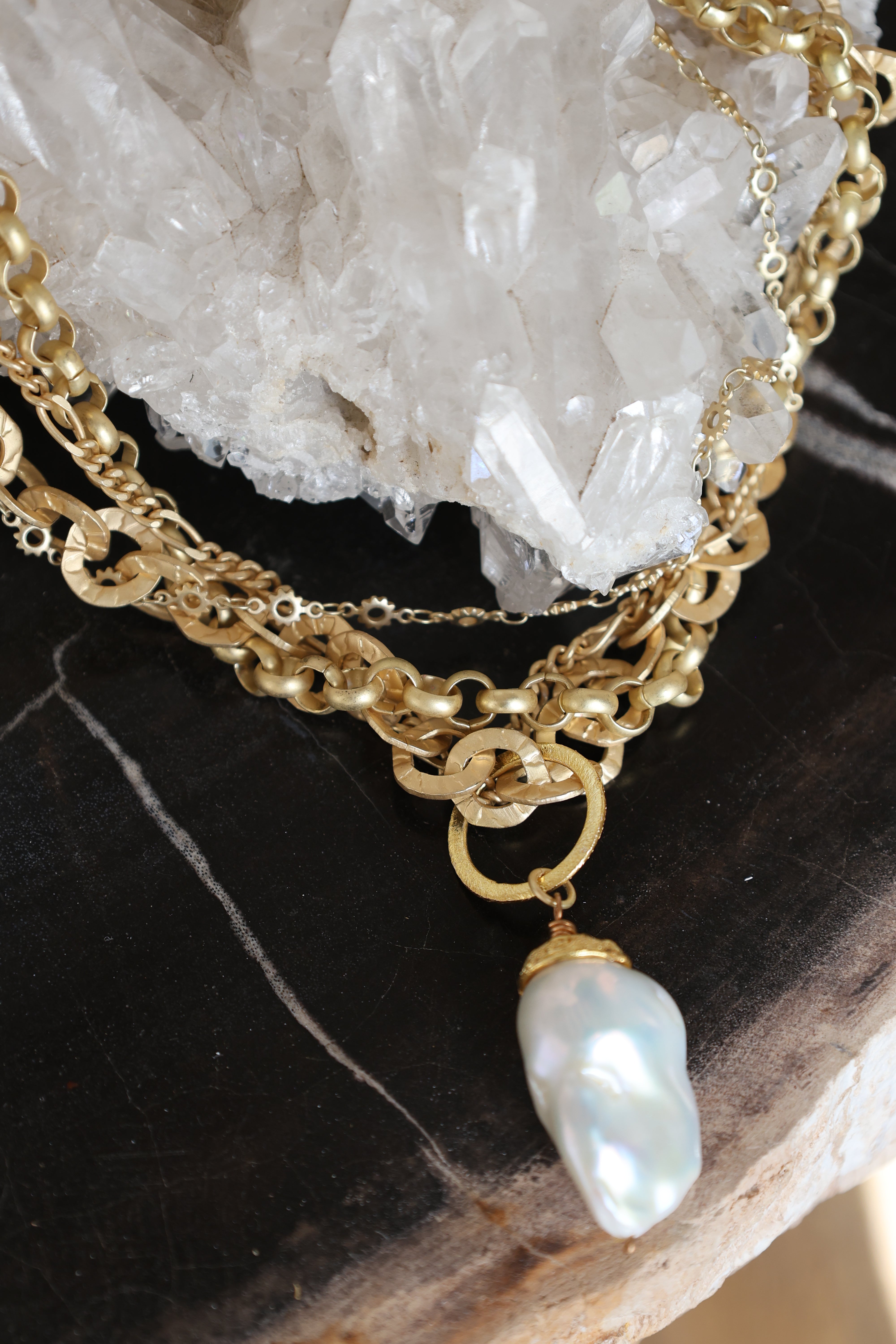 (pronounced flä-nûr′)Flâneur refers to the act of wandering without urgency—moving slowly, guided by instinct rather than destination. This necklace carries that same sense of ease and exploration, composed of layered matte gold-finish chains and semi-precious elements gathered into a softly intentional form.