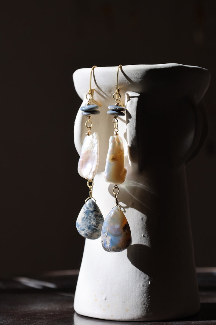 These flowing drop earrings pair soft blue opal with luminous baroque pearls. The opal stones hold a watery, clouded glow, while the pearls offer warmth and organic contrast—each element moving gently, like the sea responding to the moon. The balance of cool stone and iridescent pearl creates a sense of quiet ritual—an adornment for moments of reflection, intuition, and steady strength. Handcrafted in the high desert of Santa Fe, New Mexico.