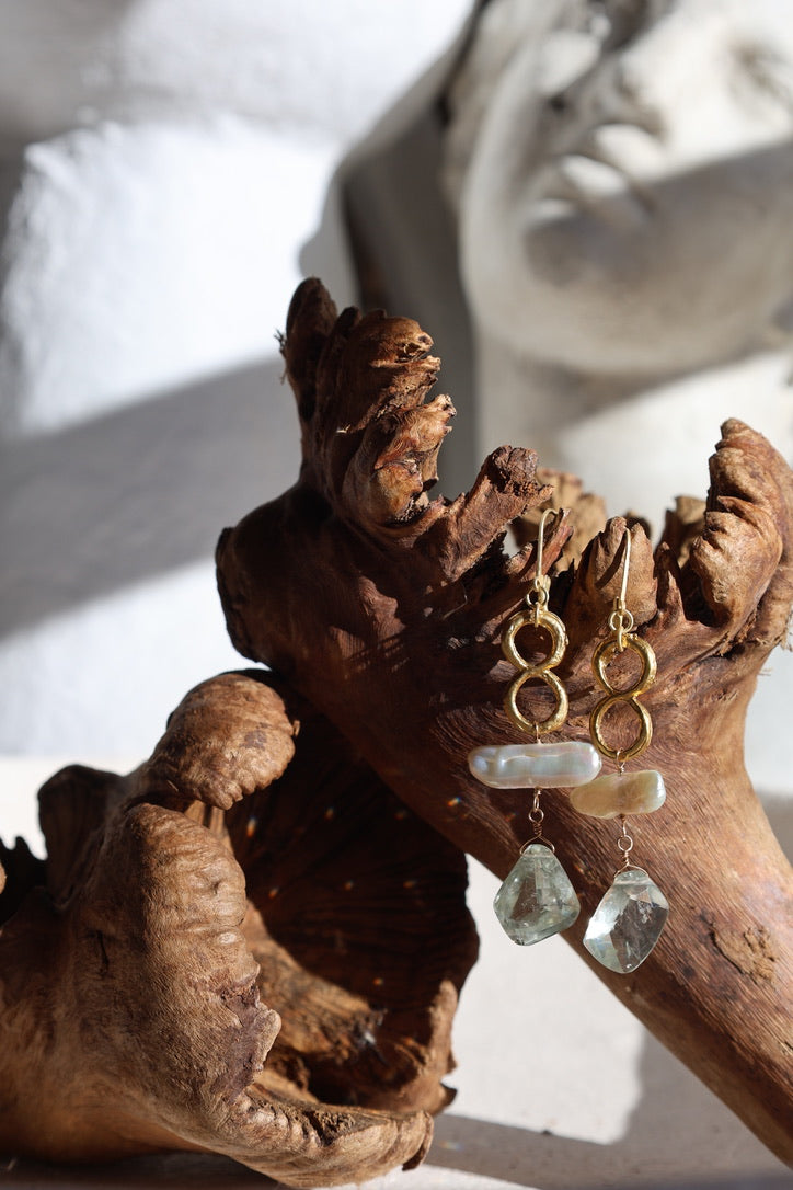 These sculptural drop earrings bring together luminous freshwater pearls and pale green faceted amethysts in a meditative medley. The pearl carries a gentle warmth, while the green amethyst holds a cool, translucent depth—like light filtering through water at dusk. Handcrafted in the high desert of Santa Fe, New Mexico.