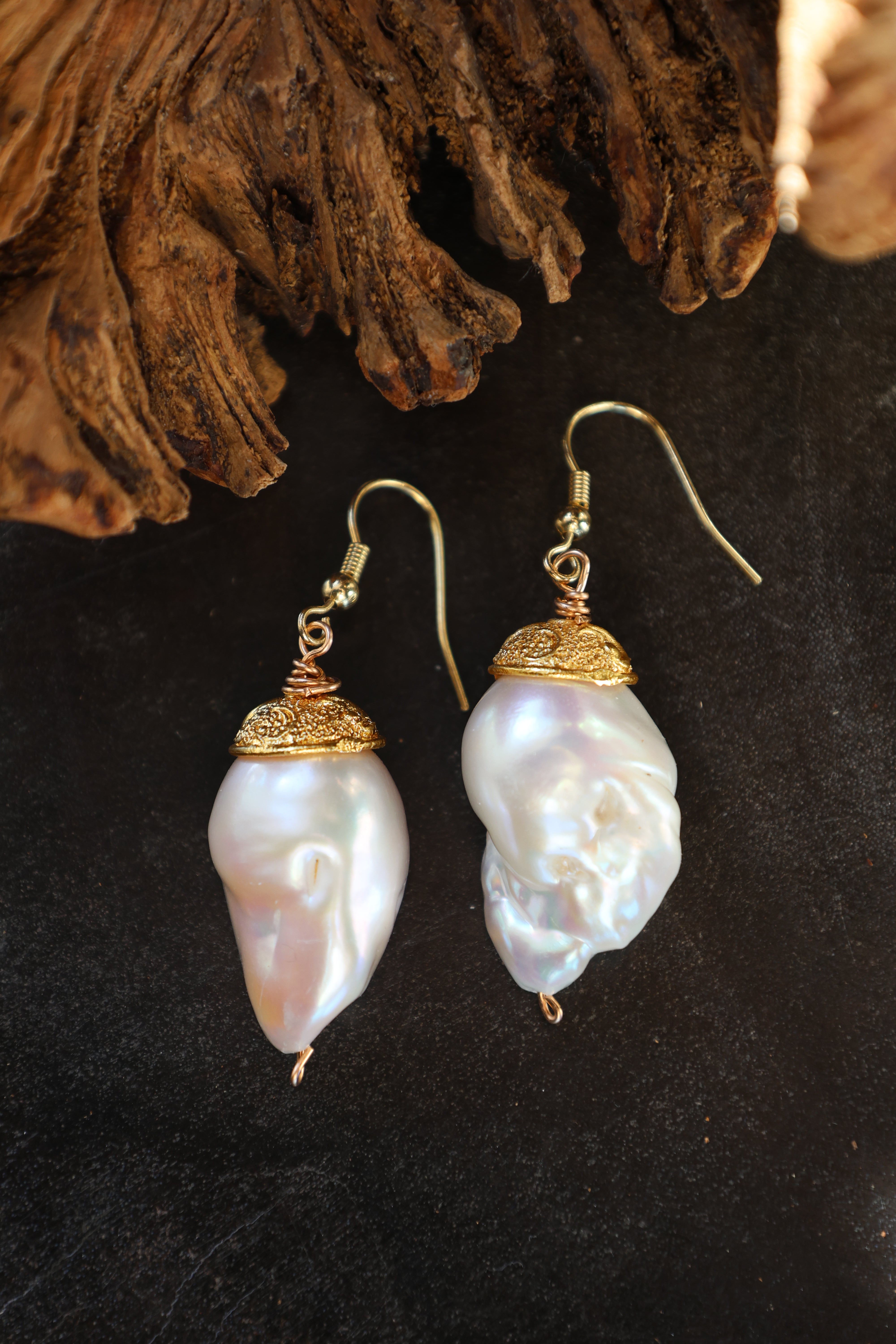 These statement earrings feature luminous natural baroque pearls, each uniquely shaped with natural curves and iridescence. Finished with textured gold caps, the design highlights the contrast between raw organic beauty and refined metallic detail.